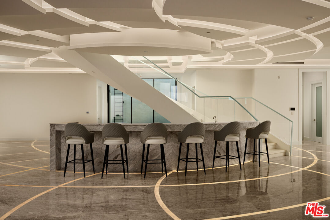 The trophy of the Beverly Hills Flats. A brand new construction 15,000 square foot estate with every amenity imaginable, a true 1 of 1. No expense spared with the most elaborate and finest Italian marbles ever placed in a home, and unparalleled attention to detail. Entry to the main level is through an arched doorway into a double-height rotunda foyer featuring a grand dual-curved travertine staircase. The circular art-glass skylight dome above, in a hand-crafted teal and ivory petal motif, is mirrored precisely in the custom stone floor medallion below, creating a palatial architectural conversation upon arrival. The main level includes two grand-scale great rooms with book-matched marble fireplace walls, a formal dining room, a private executive office, and the custom Versace powder room, fully tiled in authentic Versace Baroque porcelain with a solid-gold freestanding vessel sink, crystal pendant lighting, and a wall-mounted smart bidet toilet. The chef's kitchen is appointed with a champagne-bronze island topped in green onyx, matching onyx backsplash, Gaggenau double ovens, an integrated wine refrigerator, professional range and hood. A secondary prep kitchen is located adjacent. The upper level contains four bedrooms, each designed to the specification of a primary suite with no hierarchy between them. Every bedroom has its own fully appointed ensuite with its own distinct natural stone featuring THG Paris and Baccarat fixtures and mother of pearl inlays, a custom walk-in closet with illuminated glass-fronted wardrobe towers. Two bedrooms open to individual Juliet balconies, and the remaining two share a private sitting gallery with direct access to a terrace overlooking the rear grounds. The lower level unfolds as a dedicated entertainment and wellness floor designed for both large-scale hosting and restoration. A full stone-clad bar anchors the main lounge, which opens through folding glass walls to a secluded courtyard centered around a custom illuminated stone waterfall. A multi-level, cinema-grade theatre completes the entertainment offering. The wellness suite includes a steam shower, cedar dry sauna, and a private indoor plunge pool set beneath a fibre-optic star ceiling. A separate residential staff suite with its own access is also discreetly positioned on this level. The private elevator connects all three floors and is finished in mirror-polished champagne steel with a backlit four-panel amber and teal onyx feature wall and a marble inlaid floor. The rear grounds include a pool, elevated spa, a sunken fire pit seating area, multiple dedicated outdoor lounging and dining terraces, and a custom illuminated stone waterfall wall that serves as the rear garden focal point, equally dramatic by day and night. The property is fully integrated with a Control4 smart home system, seamlessly managing lighting, climate, audio-visual, security, pool systems, motorized walls, and architectural lighting throughout. Estates of this scale, level of finish, and position in The Flats rarely become available, with offerings of this caliber surfacing only a handful of times per decade.