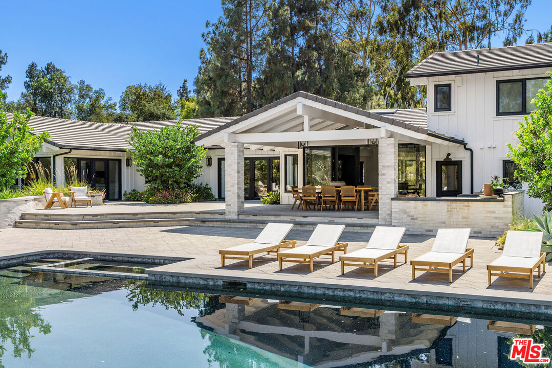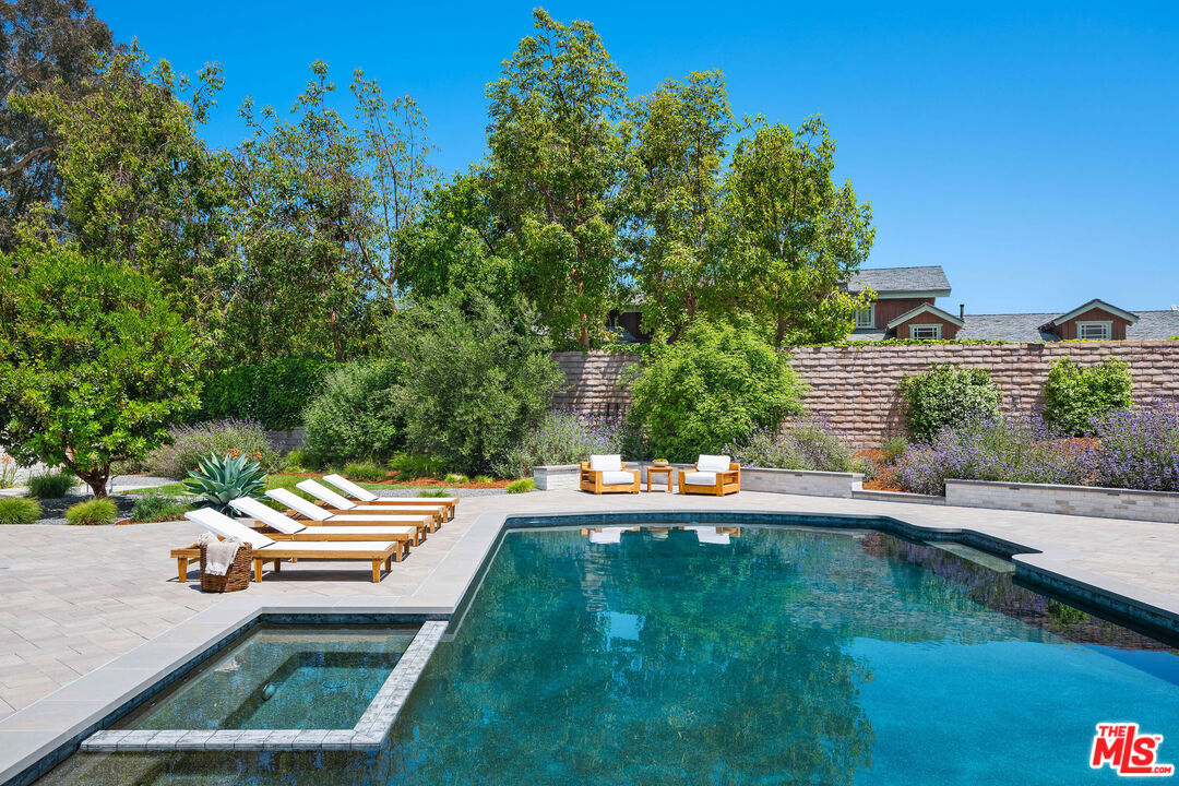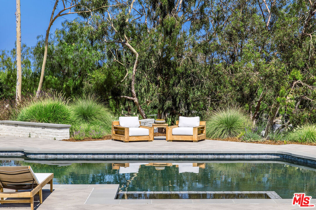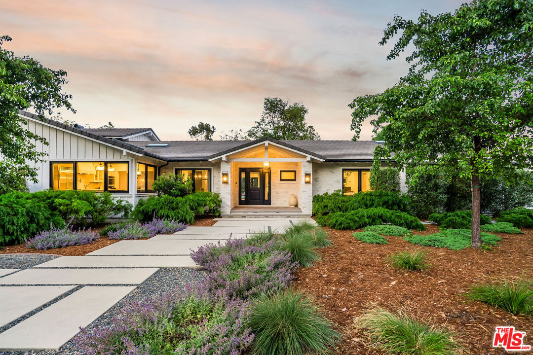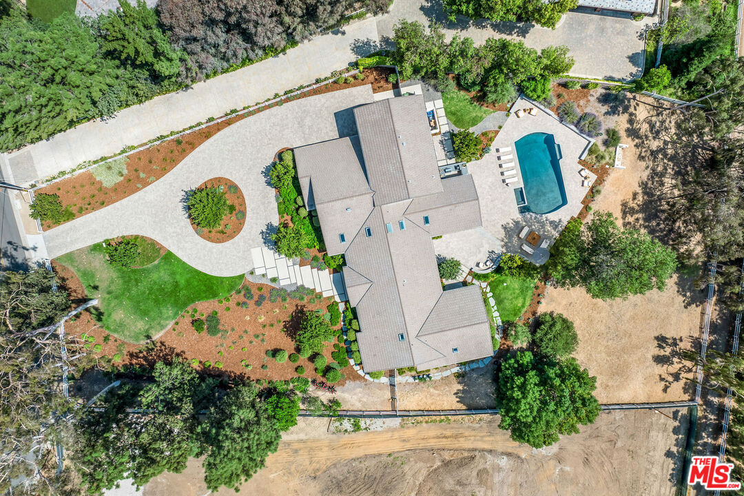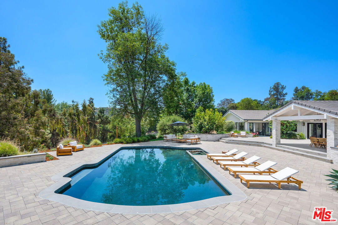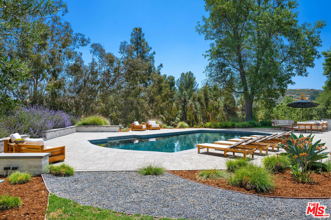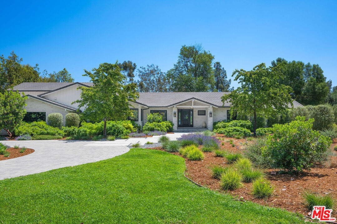 This quintessential Hidden Hills estate is like no other. An outlier in all of the best ways, this property has retained its 1960's pedigree while offering all of today's luxuries in an earthy, California palette. One of its many unique features is that it lives like a single story with only two of its six en-suite bedrooms on the second floor. Situated on one of Hidden Hills most sought after streets on a flat lot, this property ushers you in with its long circular driveway and beautiful native landscaping. Upon entering, you'll notice the sophisticated materials used to transform this home into a sanctuary for everyday living and entertaining. Designed by Jessica Risko Smith to capture luxurious comfort as well as simplicity, this home offers understated elegance throughout. Featuring Oregon oak flooring, the elegant living room flows out to the yard through European tilt-turn doors. The spacious family room has gorgeous vaulted ceilings with skylights and leads out to a covered al fresco dining area. The spectacular kitchen also has vaulted ceilings and skylights as well as dual marble topped islands. The perimeter soapstone countertops and cabinetry are framed with European tilt-turn windows with views to the front. A walk-in pantry and high-end Miele and SubZero appliances elevate the space. Adjacent family and dining rooms offer seamless flow for entertaining. Three en-suite bedrooms with stunning baths as well as a stackable laundry closet lead to the main level primary suite. The primary suite features cathedral ceilings, dual walk-in closets and doors leading to the patio. The spa-like primary bath has curated details such as an oak dual vanity with center storage, marble flooring, soaking tub and large shower. Additional highlights include a 500 sq ft office/flex space which opens to the yard, a spacious mudroom with prep sink and full laundry, powder room and beautiful pool bath with shower. Two additional vaulted-ceiling bedrooms are located upstairs, each ideal as guest suites or additional primary suites. Outdoor living is just as impressive, with a Pebble Tec pool and spa, a built-in BBQ with soapstone counters, a covered patio, and beautifully landscaped grounds. The 1.25-acre lot also includes a flat area suitable for a barn, ADU, tennis court, or other structure. This home is both high-performance and highly comfortable. Every detail has been thoughtfully considered to support a lifestyle that is elevated, and beautifully in tune with its surroundings. Every system - from foundation to roof - were upgraded, creating a property that blends modern function with timeless design. All located in prestigious Hidden Hills with its top tier security, numerous community amenities, horseback riding arenas and trails, and Blue Ribbon schools.