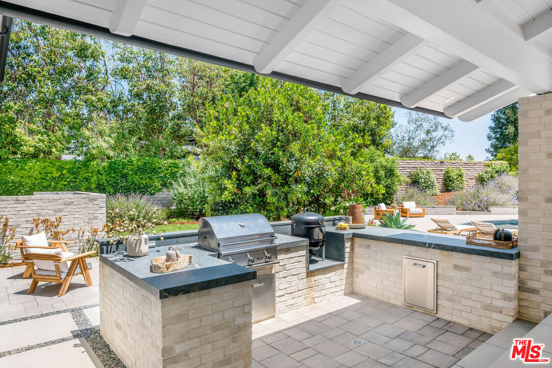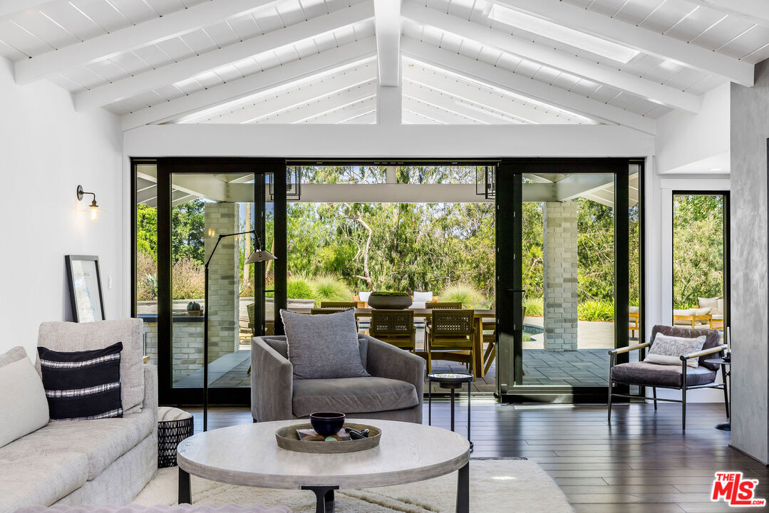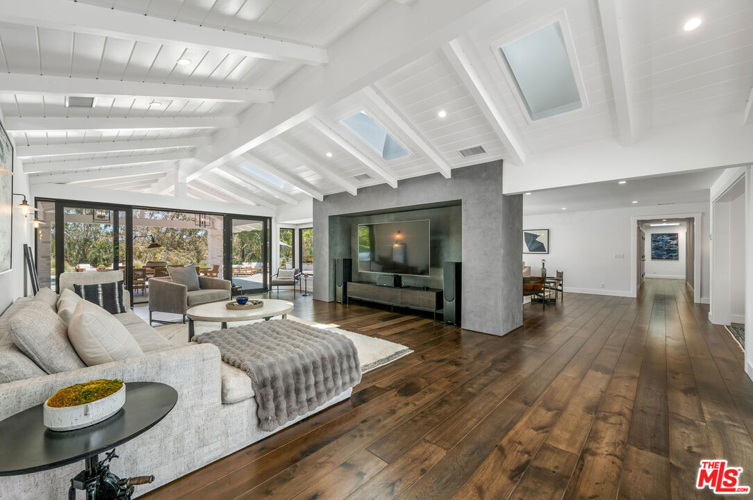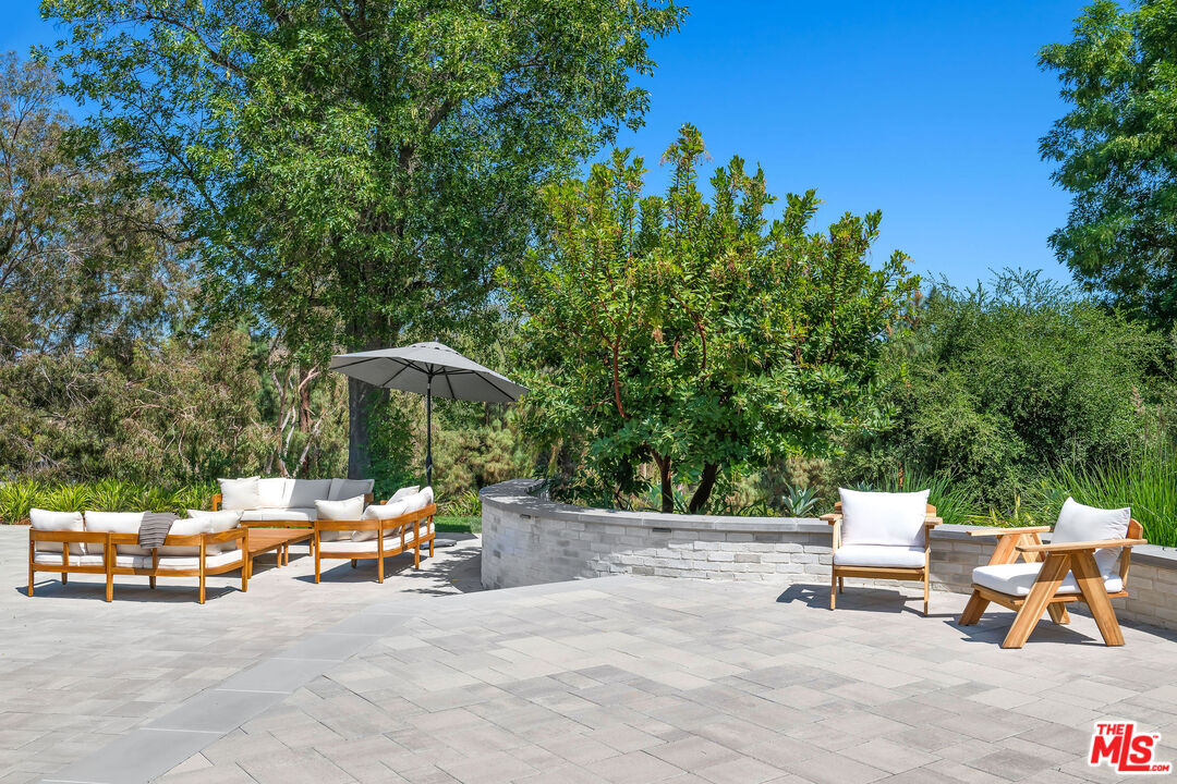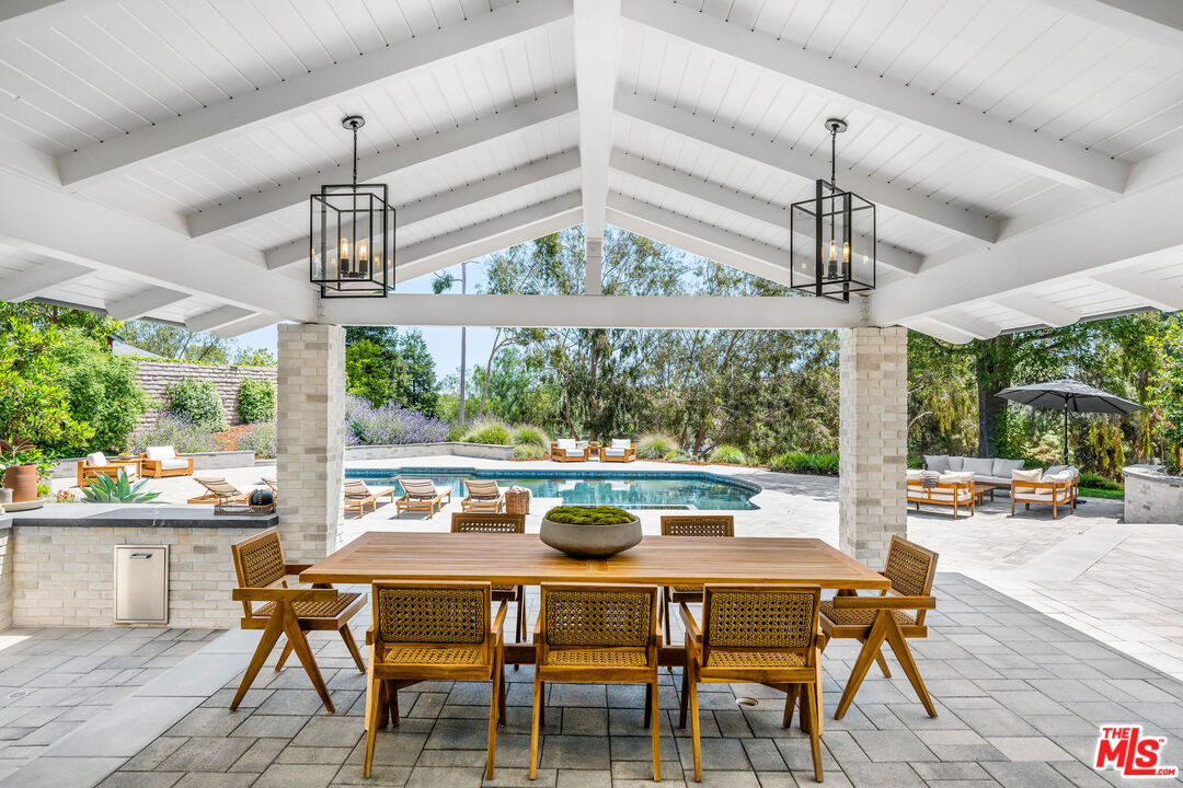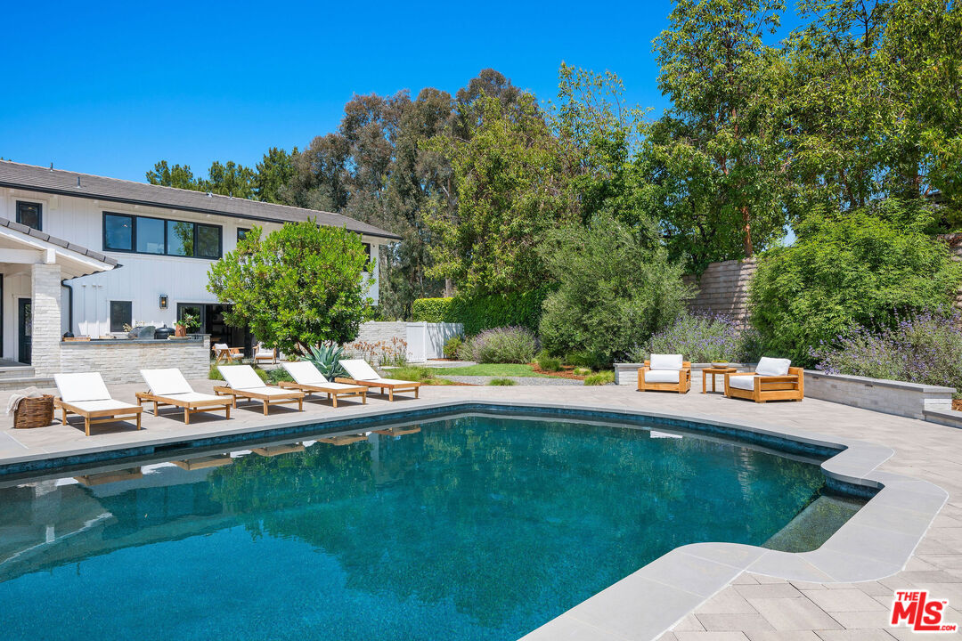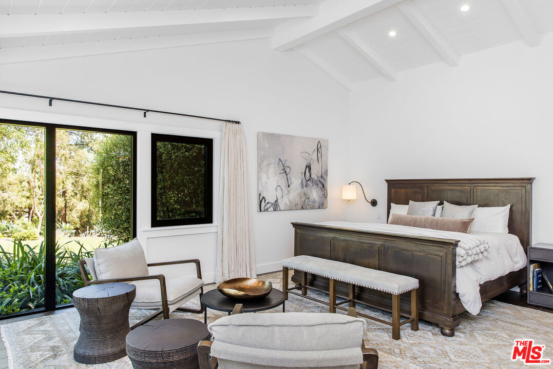 This quintessential Hidden Hills estate is like no other. An outlier in all of the best ways, this property has retained its 1960's pedigree while offering all of today's luxuries in an earthy, California palette. One of its many unique features is that it lives like a single story with only two of its six en-suite bedrooms on the second floor. Situated on one of Hidden Hills most sought after streets on a flat lot, this property ushers you in with its long circular driveway and beautiful native landscaping. Upon entering, you'll notice the sophisticated materials used to transform this home into a sanctuary for everyday living and entertaining. Designed by Jessica Risko Smith to capture luxurious comfort as well as simplicity, this home offers understated elegance throughout. Featuring Oregon oak flooring, the elegant living room flows out to the yard through European tilt-turn doors. The spacious family room has gorgeous vaulted ceilings with skylights and leads out to a covered al fresco dining area. The spectacular kitchen also has vaulted ceilings and skylights as well as dual marble topped islands. The perimeter soapstone countertops and cabinetry are framed with European tilt-turn windows with views to the front. A walk-in pantry and high-end Miele and SubZero appliances elevate the space. Adjacent family and dining rooms offer seamless flow for entertaining. Three en-suite bedrooms with stunning baths as well as a stackable laundry closet lead to the main level primary suite. The primary suite features cathedral ceilings, dual walk-in closets and doors leading to the patio. The spa-like primary bath has curated details such as an oak dual vanity with center storage, marble flooring, soaking tub and large shower. Additional highlights include a 500 sq ft office/flex space which opens to the yard, a spacious mudroom with prep sink and full laundry, powder room and beautiful pool bath with shower. Two additional vaulted-ceiling bedrooms are located upstairs, each ideal as guest suites or additional primary suites. Outdoor living is just as impressive, with a Pebble Tec pool and spa, a built-in BBQ with soapstone counters, a covered patio, and beautifully landscaped grounds. The 1.25-acre lot also includes a flat area suitable for a barn, ADU, tennis court, or other structure. This home is both high-performance and highly comfortable. Every detail has been thoughtfully considered to support a lifestyle that is elevated, and beautifully in tune with its surroundings. Every system - from foundation to roof - were upgraded, creating a property that blends modern function with timeless design. All located in prestigious Hidden Hills with its top tier security, numerous community amenities, horseback riding arenas and trails, and Blue Ribbon schools.