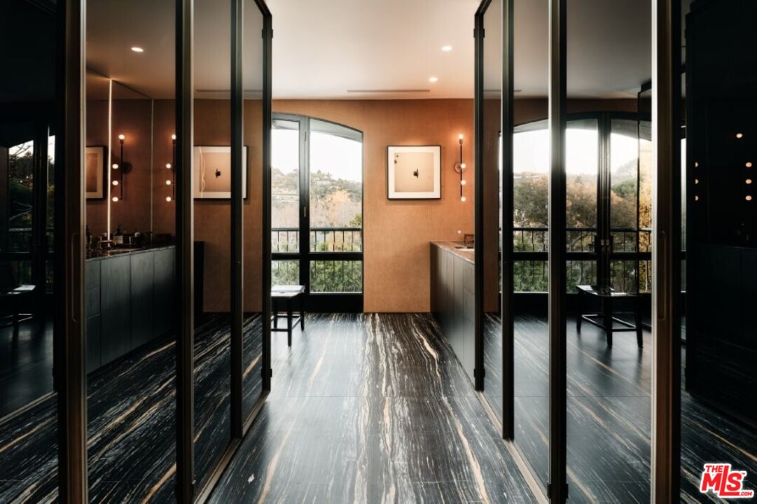 This Bel Air John Elgin Woolf-designed residence, his personal home, is one of his finest restored works. Known as the Father of Hollywood Regency, Woolf's iconic design is a key piece of LA architectural history. Jack Wolf masterfully blended traditional and modern design for a unique, glamorous style. Restored and reimagined by RIOS under Mark Rios FAIA FASLA and featured in Architectural Digest, this 8,400sf gem blends timeless elegance, fresh modern elements, bespoke upgrades and refined spaces for elevated living and entertaining. Set on nearly three-quarters of an acre behind private gates, soaring hedges and a large motor court, this thoughtfully designed home features 6 bedrooms, 6 bathrooms, 2 powder rooms and striking details like skylights, bold colors, mirrors and glass walls. Iconic Woolf elements in the oval windows and oversized Pullman doors preserve the home's original Hollywood Regency character. The soaring foyer with wood floors and floor-to-ceiling glass walls is flooded with natural light. At the heart of the home, a tranquil courtyard artfully divides the cocktail lounge from the Red Library Room. The spacious cocktail lounge features a sculptural fireplace, anchored by a custom floating black polished bar, built-in shelving, original sconces, sitting area and wraparound glass walls framing the grounds. The Red Library Room features a marble-clad fireplace, herringbone wood floors, bespoke built-ins and floor-to-ceiling shelving, complemented by a 100" TV home theater system for a cinematic experience. This wing also houses two elegantly appointed bedroom suites, each with unique design elements, including vibrant bathroom suites. A main floor third bedroom suite completes the sleeping quarters. The two-story formal dining room features expansive walls for art and an original Woolf antique mirrored ceiling with skylights. Signature Woolf elements, including the original mirrored dining table, anchor the space, preserving Hollywood Regency charm and elevating its grandeur. The sleek, all-black and stainless-steel gourmet kitchen pairs discreet Bulthaup cabinetry with top-tier appliances, an elongated wood butcher block island and a secondary working kitchen. The octagonal breakfast room opens into a glass-walled pavilion with custom cabinetry and serene views. Double doors lead to the swimming pool area with sunken living room, fire pit and Moroccan-inspired glass pavilion. Stone paths lead to a serene koi pond, complemented by a pavilion with outdoor kitchen. Inside, ascend the sculptural staircase, framed by glass walls to the primary suite sanctuary, where a balcony overlooks lush grounds, complemented by dual spa-inspired bathrooms and custom walk-in closets. One bathroom showcases bold black marble, textured wall coverings and a spacious closet, which connects to an adjoining bedroom suite (currently an office). The second bathroom dazzles with white marble, a custom Rios-designed stone soaking tub, a marble vanity and walk-in closet with chic dressing room and elevator. Additional amenities include a wine room, separate fully equipped gym with en-suite bathroom (can also function as a guest suite), house manager's office, utility room and a two-car garage, all enhanced by state-of-the-art integrated music, entertainment and lighting system. The property also offers a rare opportunity for an accessory building or ADU with a separate street entrance. This home presents a distinctive yet very comfortable way to live, offering refined living and tranquility within this exclusive enclave of Bel Air.