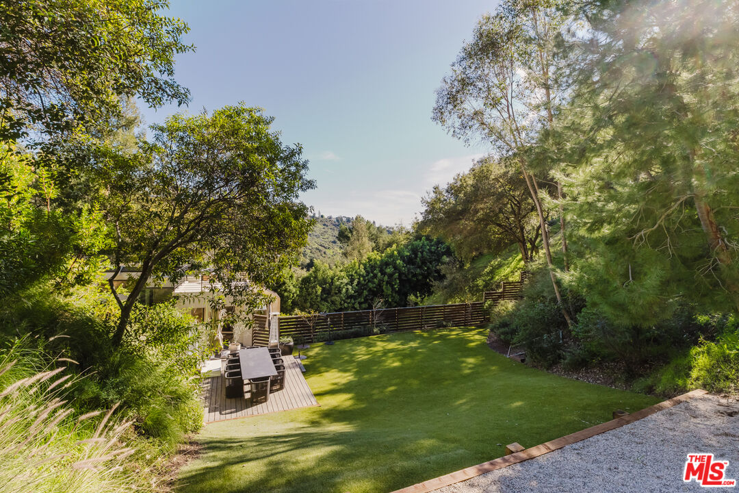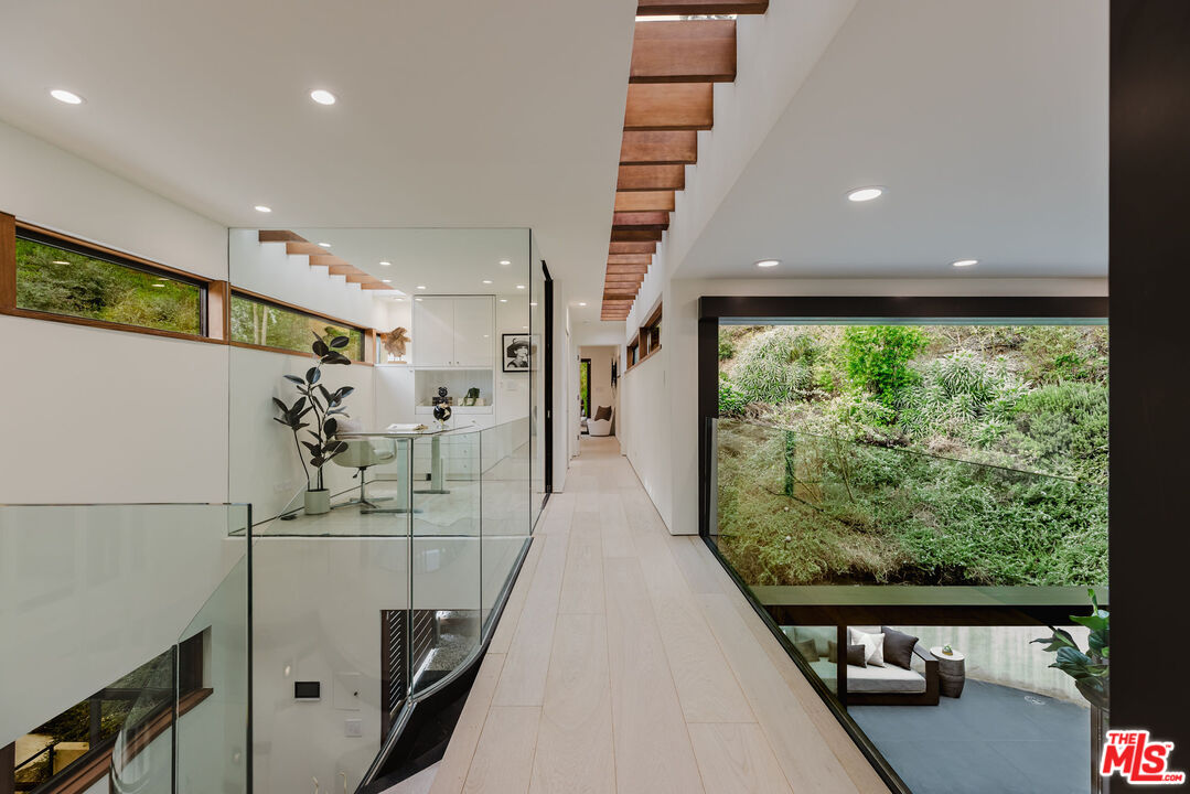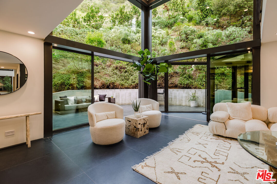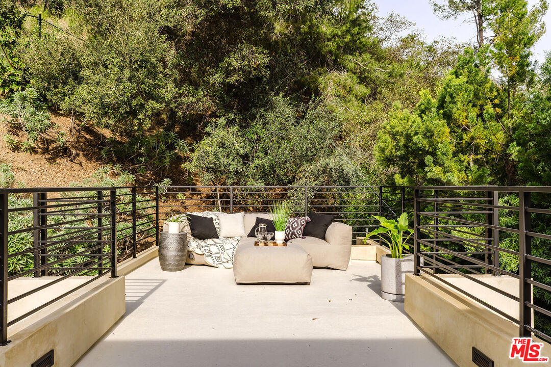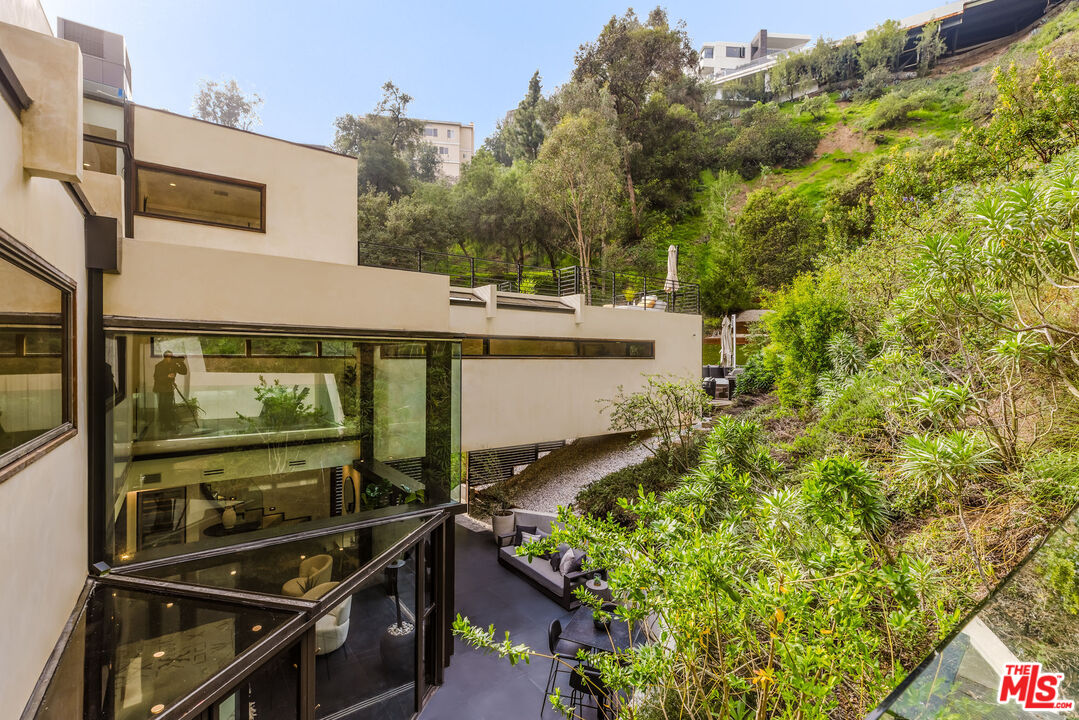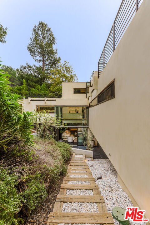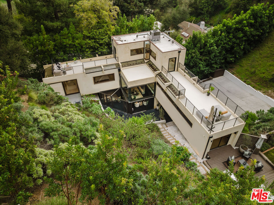 Tucked at the end of a quiet cul-de-sac in a secluded Bel Air canyon, this reimagined, architecturally designed modern residence offers exceptional privacy, while remaining just five minutes from Sunset Boulevard, a few minutes from the Beverly Hills Golden Triangle, and approximately ten minutes from UCLA. Enjoy effortless access to Hotel Bel-Air, Rodeo Drive, and the premier shopping and dining corridors of Beverly Hills and Bel Air, plus Westfield Century City, with quick access to the 405 Freeway for convenient connectivity across the Westside and beyond. Originally designed by local architect John Kilbane in the tradition of John Lautner, this one of a kind residence sits on approximately 1.5 acres and spans across approximately 3,000 square feet. The home features three bedrooms and three-and-a-half bathrooms across three levels. The residence has undergone a comprehensive exterior transformation and is finished in new beige stucco, thoughtfully reimagined with materials selected for the Bel Air hillside environment. Inside, walls of glass define the main living spaces, complemented by new and refinished wood flooring, updated electrical systems, and a comprehensive LED lighting upgrade. A Lutron-based lighting system with programmable scenes is paired with automated blinds and smart home security. The kitchen is outfitted with premium appliances, including a Sub-Zero bottom-freezer refrigerator with a new compressor, Gaggenau range, as well as Miele ovens and dishwasher. Situated between the living and dining rooms lies a premium dual-zone wine refrigerator. Living and dining areas extend into multiple sunrooms and outdoor terraces, with two exterior balconies enhancing indoor-outdoor living across levels. The primary suite offers a spa-style ensuite bathroom and a private balcony overlooking the canyon. A sculptural spiral staircase leads to the third level, a true retreat with its own bedroom, steam shower, and refreshed mini kitchen, well suited for a home office, studio, gym, or guest suite. Bathrooms have been refreshed with updated sinks, faucets, shower heads, exhaust fans and new grout throughout. The grounds are designed for enjoyment and ease of ownership, featuring expansive flat outdoor areas, multiple seating and entertaining zones with upgraded fencing. Above the main flat backyard space lies wooden steps leading up above to another flat grass area which allows for additional entertainment space, a dog run, walking trail, and even further possibilities for an additional structure. This vantage point from above allows for even greater mountain views and offers a world of possibilities while keeping total privacy. Conceived as a living landscape by UK arborist Josh Marcuson, the gardens feature curated native plantings, fruit trees, and a butterfly and bee garden with extensive mallow plantings selected to support Monarch butterflies creating a rare and meaningful nature connection. A professionally installed irrigation system supports water-efficient landscaping throughout the property, while outdoor lighting across the front, back and side yards and parking lot adds both ambiance and safety. Additional features include gated entry with smart access, a backup generator, two single-car garages, and six guest parking spaces. The offering includes four additional parcels, five total, providing long-term flexibility and value. The property's size and configuration offer flexibility for future exploration and potential building, subject to buyer due diligence and approvals.