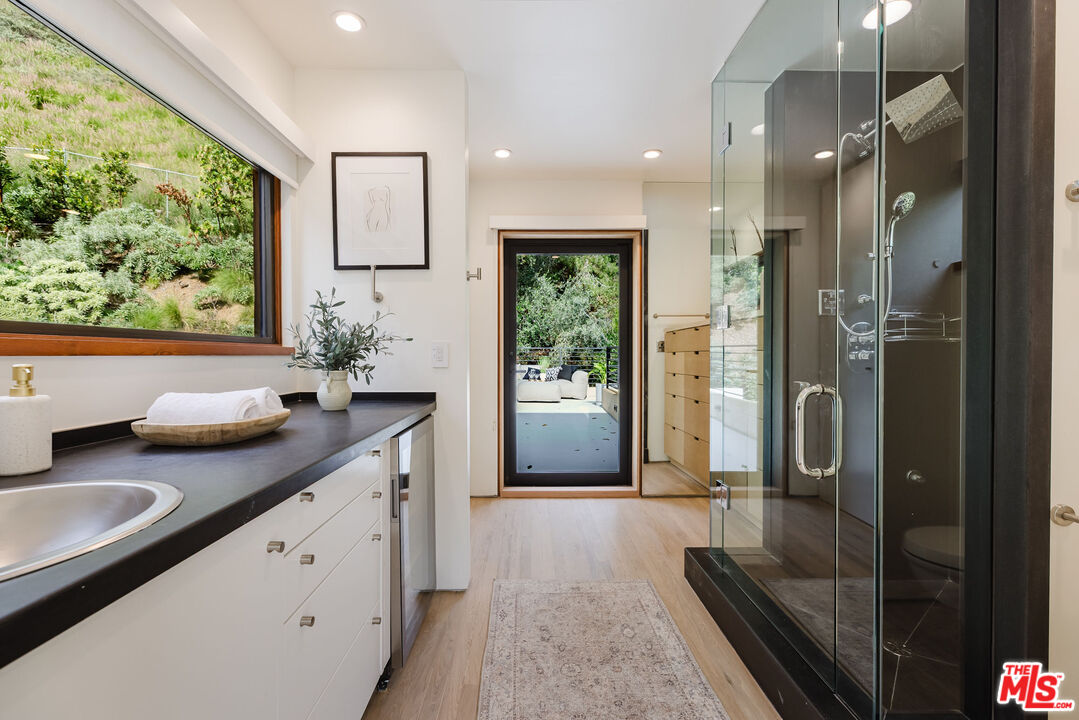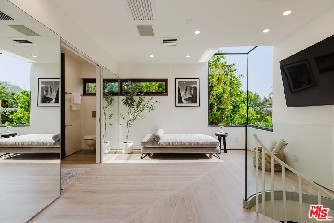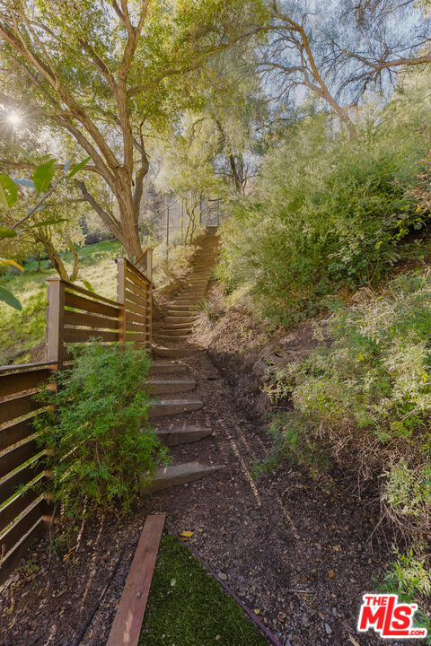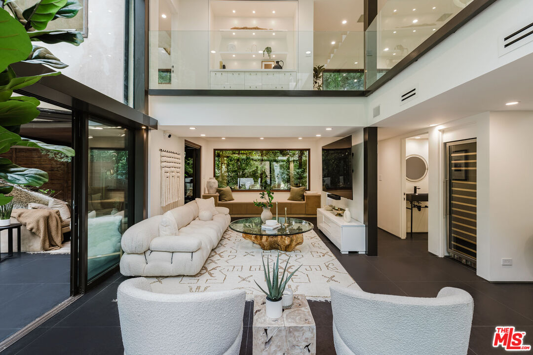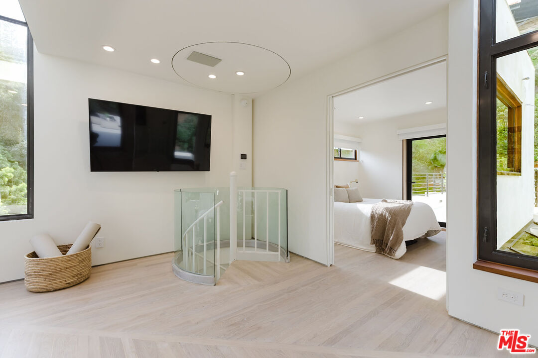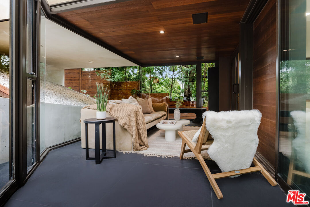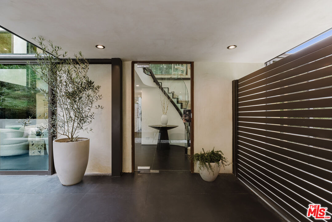 Tucked at the end of a quiet cul-de-sac in a secluded Bel Air canyon, this reimagined, architecturally designed modern residence offers exceptional privacy, while remaining just five minutes from Sunset Boulevard, a few minutes from the Beverly Hills Golden Triangle, and approximately ten minutes from UCLA. Enjoy effortless access to Hotel Bel-Air, Rodeo Drive, and the premier shopping and dining corridors of Beverly Hills and Bel Air, plus Westfield Century City, with quick access to the 405 Freeway for convenient connectivity across the Westside and beyond. Originally designed by local architect John Kilbane in the tradition of John Lautner, this one of a kind residence sits on approximately 1.5 acres and spans across approximately 3,000 square feet. The home features three bedrooms and three-and-a-half bathrooms across three levels. The residence has undergone a comprehensive exterior transformation and is finished in new beige stucco, thoughtfully reimagined with materials selected for the Bel Air hillside environment. Inside, walls of glass define the main living spaces, complemented by new and refinished wood flooring, updated electrical systems, and a comprehensive LED lighting upgrade. A Lutron-based lighting system with programmable scenes is paired with automated blinds and smart home security. The kitchen is outfitted with premium appliances, including a Sub-Zero bottom-freezer refrigerator with a new compressor, Gaggenau range, as well as Miele ovens and dishwasher. Situated between the living and dining rooms lies a premium dual-zone wine refrigerator. Living and dining areas extend into multiple sunrooms and outdoor terraces, with two exterior balconies enhancing indoor-outdoor living across levels. The primary suite offers a spa-style ensuite bathroom and a private balcony overlooking the canyon. A sculptural spiral staircase leads to the third level, a true retreat with its own bedroom, steam shower, and refreshed mini kitchen, well suited for a home office, studio, gym, or guest suite. Bathrooms have been refreshed with updated sinks, faucets, shower heads, exhaust fans and new grout throughout. The grounds are designed for enjoyment and ease of ownership, featuring expansive flat outdoor areas, multiple seating and entertaining zones with upgraded fencing. Above the main flat backyard space lies wooden steps leading up above to another flat grass area which allows for additional entertainment space, a dog run, walking trail, and even further possibilities for an additional structure. This vantage point from above allows for even greater mountain views and offers a world of possibilities while keeping total privacy. Conceived as a living landscape by UK arborist Josh Marcuson, the gardens feature curated native plantings, fruit trees, and a butterfly and bee garden with extensive mallow plantings selected to support Monarch butterflies creating a rare and meaningful nature connection. A professionally installed irrigation system supports water-efficient landscaping throughout the property, while outdoor lighting across the front, back and side yards and parking lot adds both ambiance and safety. Additional features include gated entry with smart access, a backup generator, two single-car garages, and six guest parking spaces. The offering includes four additional parcels, five total, providing long-term flexibility and value. The property's size and configuration offer flexibility for future exploration and potential building, subject to buyer due diligence and approvals.