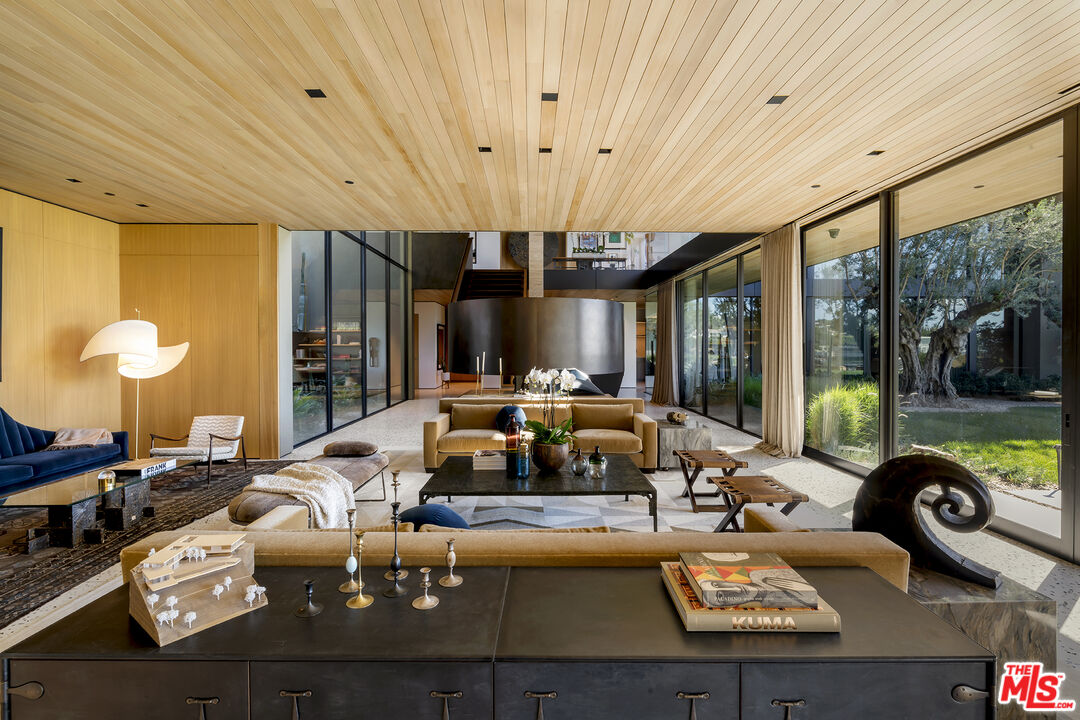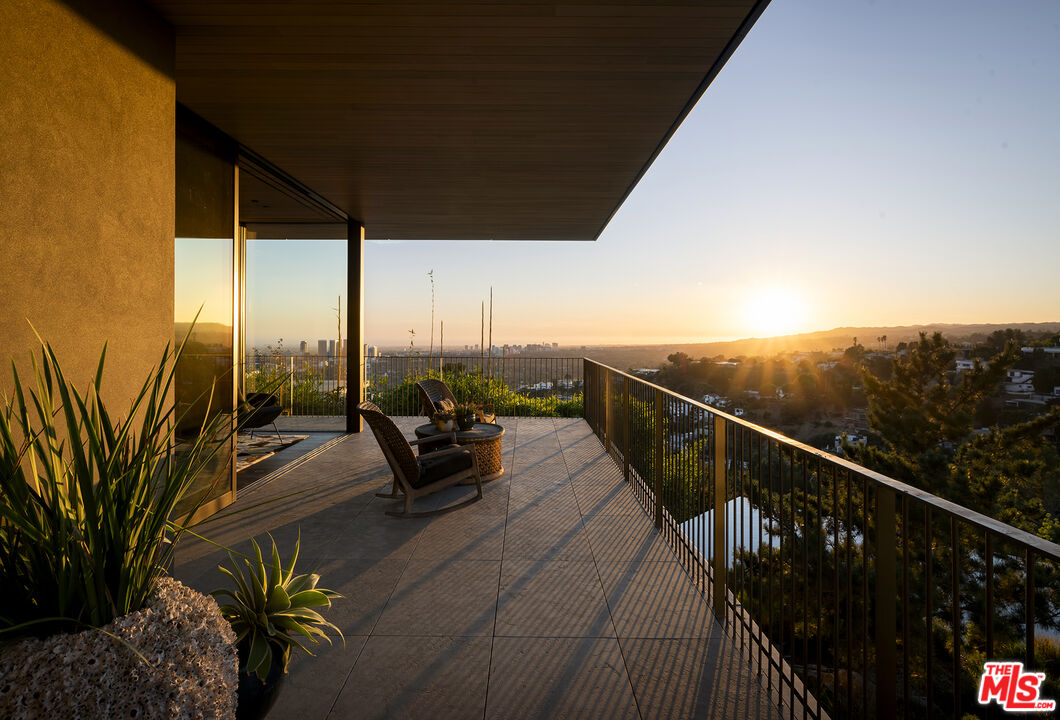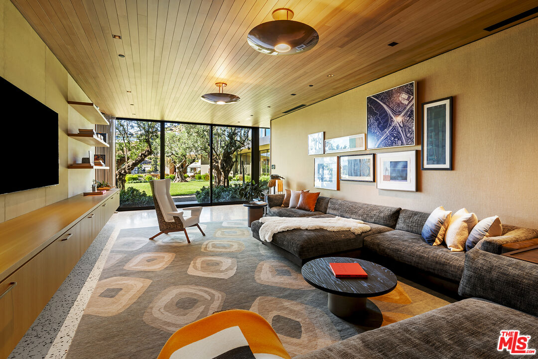 A meticulously curated modern mountaintop retreat by master architects Woods + Dangaran, featuring spectacular interiors by Adam Miller. Perfectly situated on a double lot at the top of the Birds, the property offers absolute privacy and stunning curb appeal, highlighted by a breeze block wall framed between two bronze-finish cantilevered rooflines. Architectural magnificence flows from the exterior to reveal a spectacular panoramic view, from Beverly Hills and Century City to the Pacific Ocean and surrounding mountaintops, on this sunset-facing marvel. This L-shaped estate features floor-to-ceiling glass in all common areas and welcomes the beauty of the outdoors in, with a continuous flow of aesthetics, allowing for a rich earth-tone ambiance and streams of natural light. Cedar plank ceilings throughout both levels are custom milled to the exact width of the recessed lighting, showcasing a commitment to detail throughout. A magnificent six-foot-wide blackened steel staircase curves around a raked double-height Italian travertine wall leading down to the lower-level living room. The upstairs stuns with smoked walnut flooring by Madera, through to the stairs. The lower level flows with custom terrazzo flooring, with an off-white base and oversized stones in shades of black, caramel, tan, and pale blue-gray, which extends to the outdoor patios and entertainment decks.Breathtaking primary kitchen with an adjacent chef's kitchen tucked away around the corner to maximize dining options. The primary kitchen features book-matched Brazilian "Picasso" quartzite, and both kitchens feature state-of-the-art appliances that have been paneled to blend seamlessly into the surrounding millwork. Entertaining is easy with two outdoor kitchens, one on each level, each featuring Lynx gas grills, and an upper level conversation area with fire pit. Each wing embraces an expansive lawn, truly a one-of-a-kind haven, unparalleled in size, with native, drought-tolerant plants, four 150-year-old olive trees, two sculptural Japanese black pines, and wrapped with Corten steel planters that have patinated to a warm, rich rust color with red-rock boulders featured in the gardens. Also featured on the sprawling grounds of this estate, is a stunning black Hydrazzo finish pool that stretches across the entire width of the property, with a half-Olympic length swim lane, oversized Baja shelf, and spa complete with underwater speakers and LED lighting. Custom two-sided elevator connecting the car court to both interior levels of the home, climate-controlled wine room with three walls of custom white oak millwork ensuring ample storage and protection for a connoisseur's collection, and custom lighting fixtures throughout the home highlight exceptional works by Apparatus Studio, Lindsey Adelman, vintage Stilnovo, vintage Hans-Agne Jakobsson, and Allied Maker.