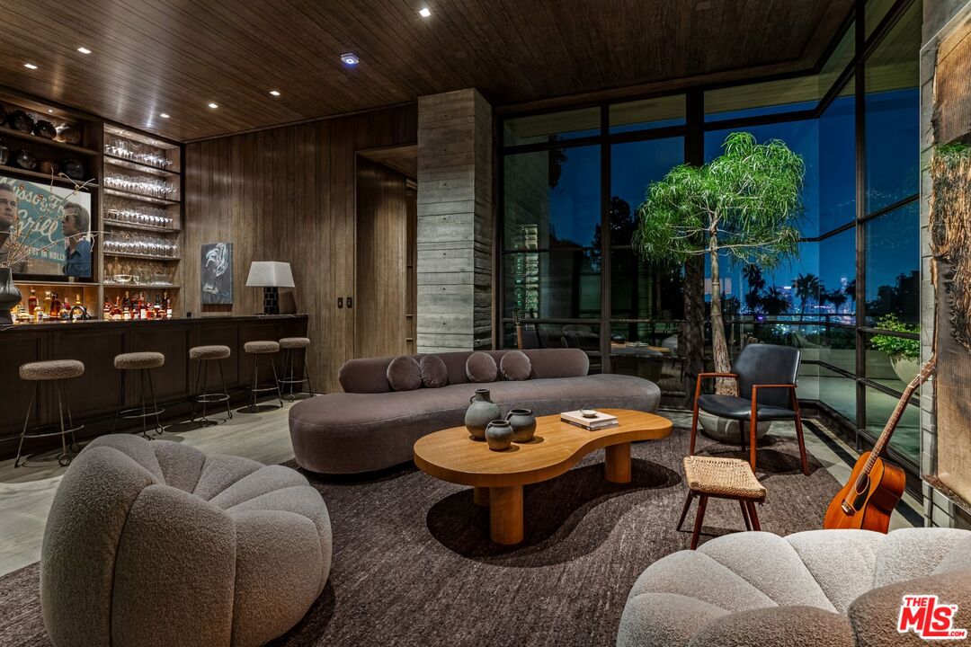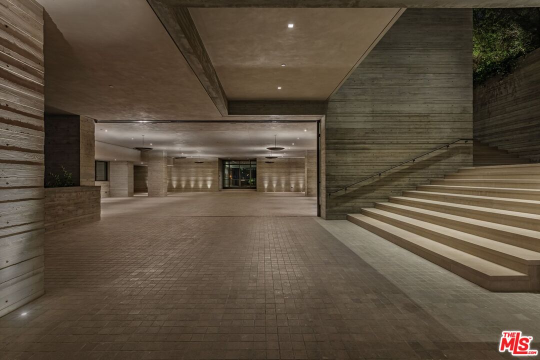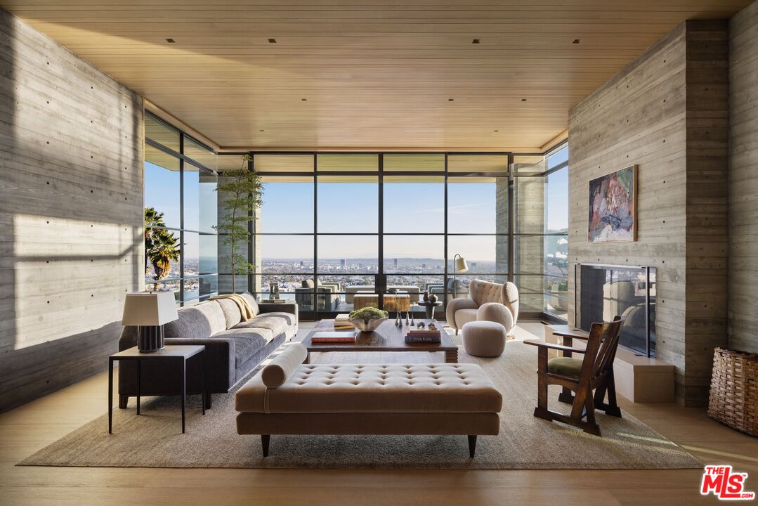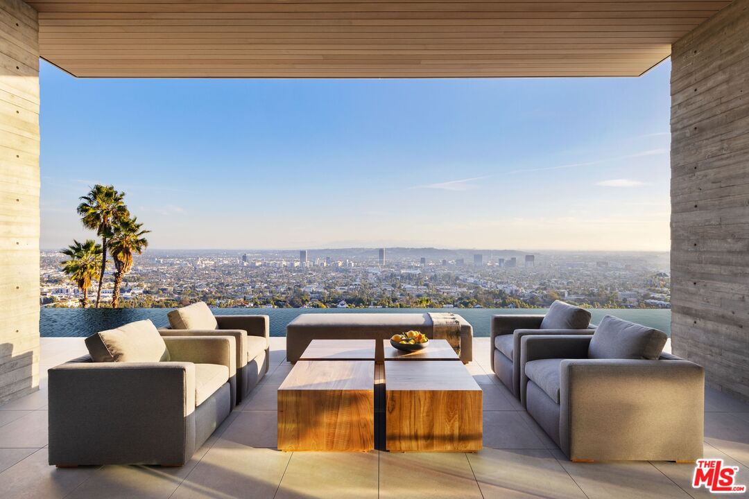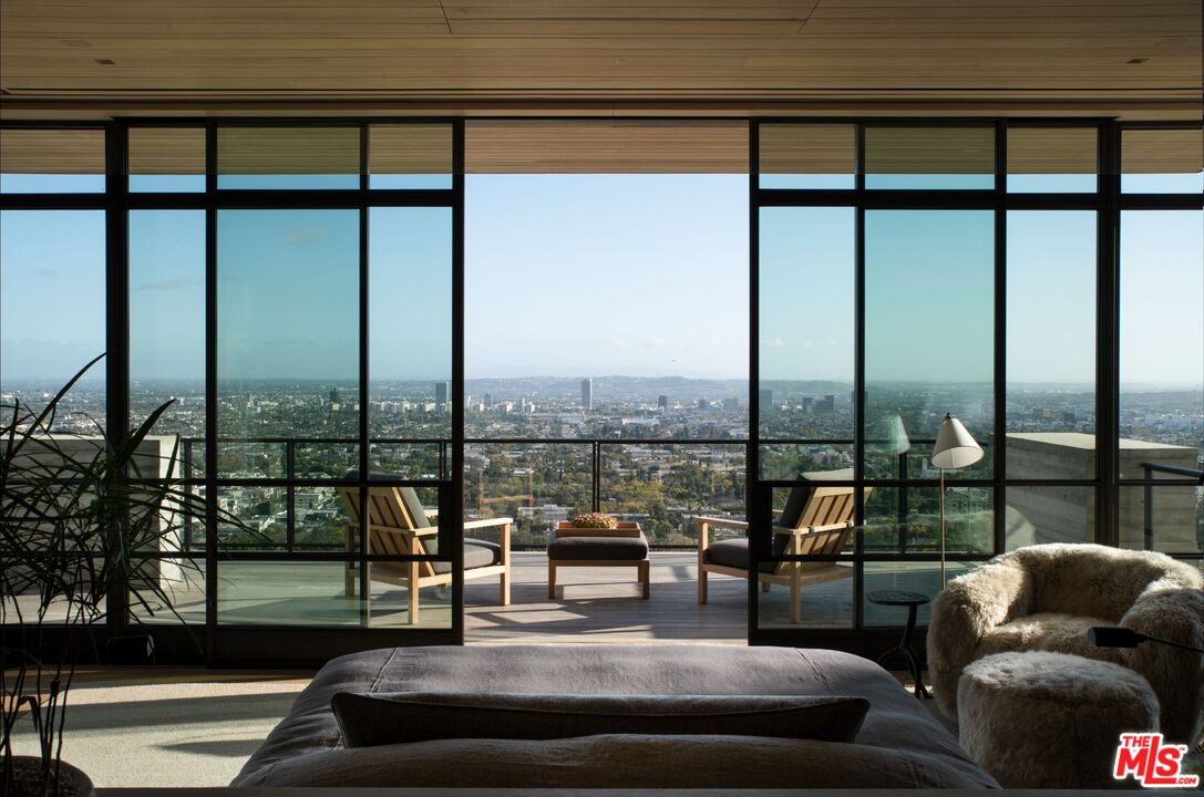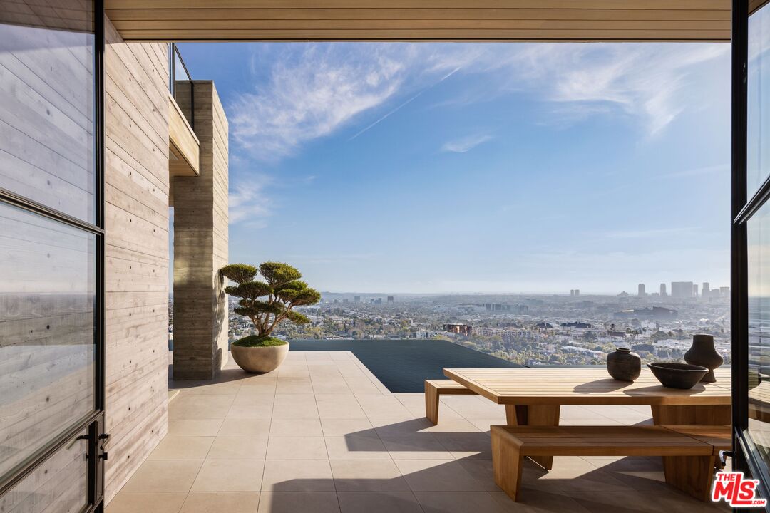 The Hollywood Hills House designed by Scott Mitchell Studio is a monumental and versatile modern villa rising out of the Hollywood Hills. The layered and terraced house - designed for living and entertaining - embraces views that span L.A.'s cityscape from east to west and out to the Pacific Ocean. This property is set on Los Angeles's most iconic promontory that extends over one acre with no neighbors on either side and 270 views of the entire city. Set at the 50-yard line of legendary hot spots Chateau Marmont, Tower Bar, and the Hollywood Bowl, the energy of the city can be seen and felt from the estate's peaceful privacy. Additionally, the property borders state land so no building can be constructed behind it, and it has private access to hiking in the famous Runyon Canyon. The form of the house follows a rigorous commitment to rich, organic materials and light. Grand outdoor decks provide seamless indoor and outdoor living. With expansive volumes over three floors, the tranquil and rooted hillside haven exudes a sense of balance, repose and a seamless connection to the natural landscape. A secluded driveway inclines to an impressive, cobbled motor court that can accommodate 12 or more cars and is nestled under the house with far-reaching views across the city. From there the villa's grand and wide staircase begins, following the form of the building, passing a large-scale, vertical water feature to the landscaped north terrace and walkway, where native plantings and open fires frame the principal steel window and door entry system. On entering, to the east is a luxurious study and to the west, an open living room with fireplace and views across the city that flows into the dining room and on to the kitchen and family room, where floor to ceiling glass sliding doors open seamlessly connecting indoor and outdoor and framing wide urban vistas. On the exterior, wire-brushed narrow Itauba deck boards and an elegant dark stone clad infinity pool and hot tub are flanked by a sunken fire pit and seating area. A stand-alone pool bar and lounge is connected by a covered breezeway adjacent to an outdoor seating area. Walkways and terraces continue around the house incorporating native oaks and under-storied plantings that are composed with elements of fire and water. On the upper level, the primary bedroom wing comprises not only the primary bedroom but separate bathrooms and dressing rooms, and a study that can be isolated from the rest of the suite by a discreet pocket door system. On the lower level is a recreational zone with state-of-the-art screening room, billiards room with lounge area, and a bar. These program elements are organized around a gracious distribution foyer which doubles as a secondary point of entry to the house and leads to the motor court, which can be converted into a conditioned, modern ballroom. The house was built over a 10-year period, and new codes have been created since its construction, preventing a home of this type ever being built again in the Hollywood Hills. The house is constructed with $30 million of solid poured-in-place board-formed concrete with three feet thick concrete walls, and over 100 caissons that go 100 feet deep. The hard cost of the construction is $3,500 a square foot not including the land. The project engaged JRC Group, Inc., arguably the best builder in the city. The house includes a multi-million-dollar Jada steel door package, custom millwork, and audio/visual.