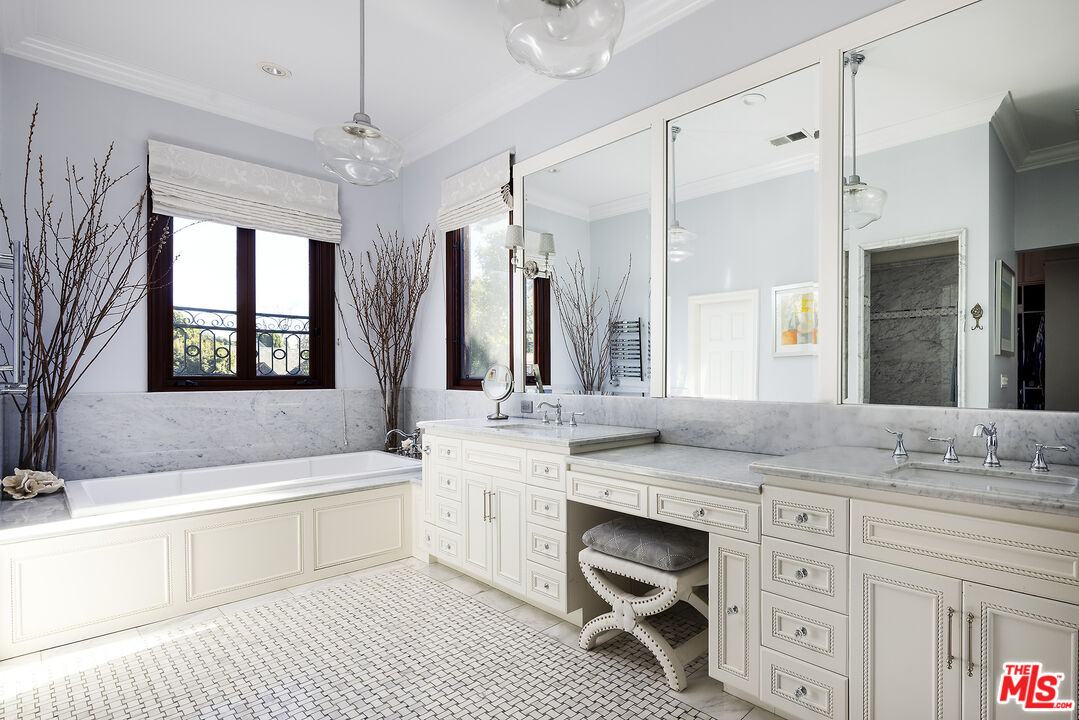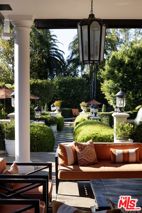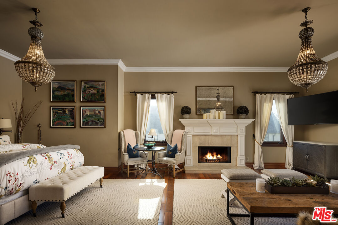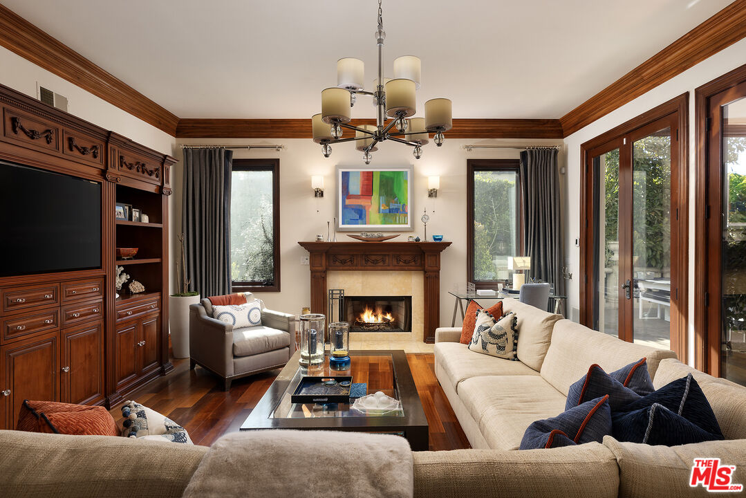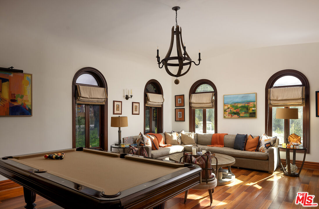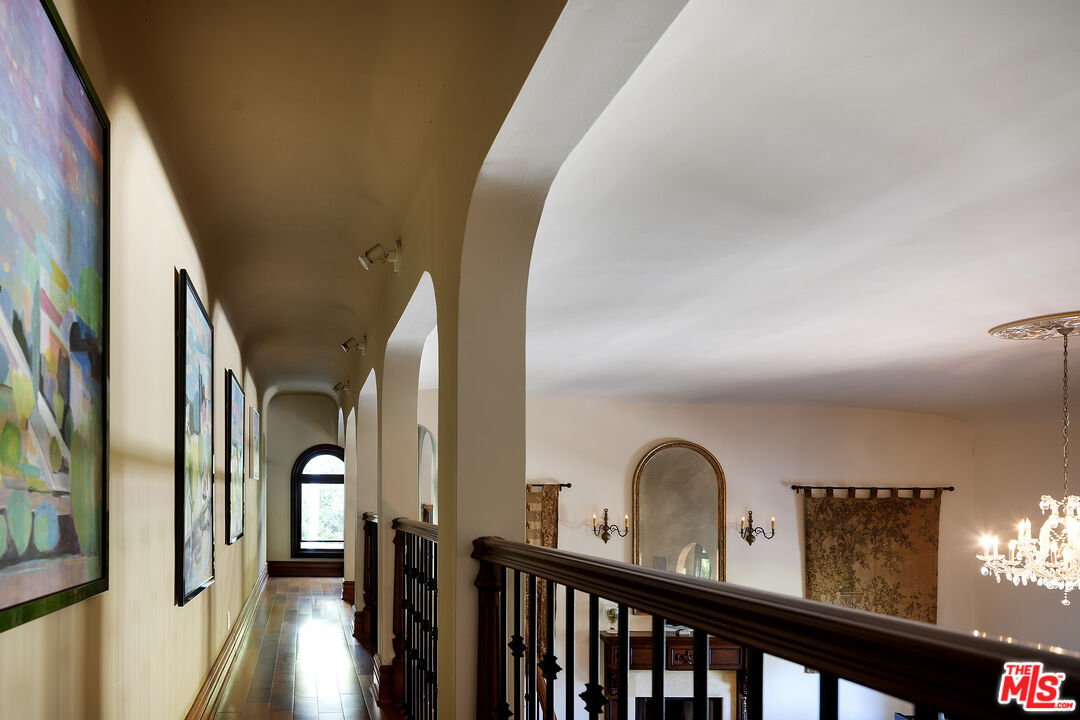 Presenting an exceptionally renovated, move-in-ready 1920s estate on two-thirds of an acre in coveted Hancock Park, offering manicured grounds enveloped by lush landscaping and pristine gardens with a variety of indoor and outdoor spaces to roam, relax, and entertain. Classic charm abounds throughout this peaceful entertainer's manse with fine finishes and premier amenities so characteristic of this distinctive, storied enclave near the Wilshire Country Club and Larchmont Village. Set behind privacy gates with an expansive motor court and circular drive, this legacy property underwent an extensive restoration by its present owners, preserving its rich architectural importance and heritage. A festooned porte-cochere proceeds to the home's enchanting portico for receiving guests. Inside, rich hardwood floors flow from the formal entrance hall and into the grand formal living room with high ceilings, double staircase, distinctive fireplace, and a series of archways that set the tone for the whole of the residence. Volume abounds throughout. A large family room has French doors that open to the outside, adjacent to the country kitchen with glass-paned cabinetry, center island with pet nook, state-of-the-art appliances including cooktop and warming drawer, and attached mudroom leading to al-fresco dining areas. Nearby, the formal dining room includes temperature-controlled wine storage, and a proper wood-paneled wet bar is configured with a tasting ledge seating three. Lounge or play pool in the billiards room, or work and study in the home office. Upstairs, the owner's wing has a sitting area with traditional fireplace and opens to its own private terrace overlooking the rear grounds. Its en-suite bathroom features a dual-sink vanity with makeup desk and separate tub and shower, and a walk-in closet is appointed with custom built-ins. A beautiful junior primary bedroom includes soaring vaulted ceilings and a fireplace with elegant marble mantle. One of the secondary bedrooms also has its own spacious balcony and opens to a Hollywood-style bathroom, and a flex space can be utilized as a pajama room or second office. There is even a bonus television/card room with a bathroom and dry sauna. Outside, curated park-like grounds offer endless special moments for rejuvenation and hosting numerous party guests in a magical setting. Enjoy an outdoor living room with wood-burning fireplace and motorized patio shades, an outdoor dining room, and sprawling grassy lawn. A European villa-style saltwater pool is pebble-finished and centered by an elegant water feature, the recreational space encircled by diamond pavers, garden vases, and pristine hedges. Other outdoor amenities include a large built-in barbecue, soothing fountain, various outdoor sitting areas, gardens, pathways, and dog run. Relish serenity and peace in this iconic historical neighborhood, the original choice of the city's founders and cherished by Los Angeles royalty for generations.