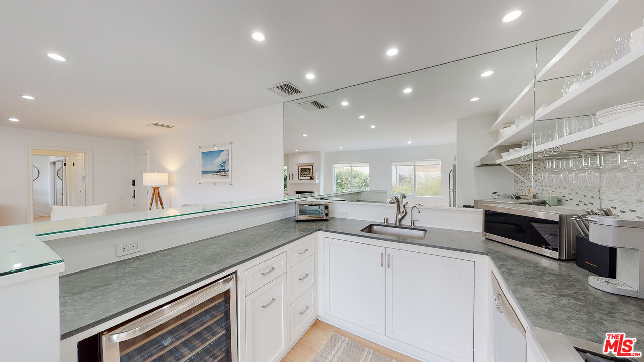 Step into coastal elegance with this sun-drenched, designer-remodeled one-bedroom, one-bathroom condo, ideally located on the sands of Malibu's coveted Carbon Beach. This top-floor residence boasts breathtaking natural light, open-sky views, and a seamless blend of modern luxury and coastal charm.The brand-new gourmet kitchen is a chef's dream, featuring high-end stainless steel appliances, a Thermador professional-grade stove, a Viking hood, and a dedicated wine refrigerator. The newly designed bathroom showcases stylish tilework and premium fixtures, while the custom-designed master closet offers exceptional storage solutions. Gorgeous hickory whitewashed hardwood floors extend throughout the space, complementing the warmth of a gas fireplace. Additional floor-to-ceiling built-in storage adds both functionality and sophistication.The complex itself is a private oasis, complete with an ocean-facing heated pool, communal BBQ areas, a newly remodeled lobby, an elevator, and secure gated entry. Enjoy direct beach access, covered garage parking, and effortless proximity to Malibu's finest restaurants, high-end boutiques, a health club, a movie theater, grocery stores, and the iconic Malibu Pier.Surrounded by multi-million-dollar oceanfront estates and lush landscaping, this exclusive retreat offers a rare opportunity to experience the best of Malibu beachfront living. Designer furniture may be available for purchase.Don't miss your chance to own a piece of paradise on Billionaire's Beach!