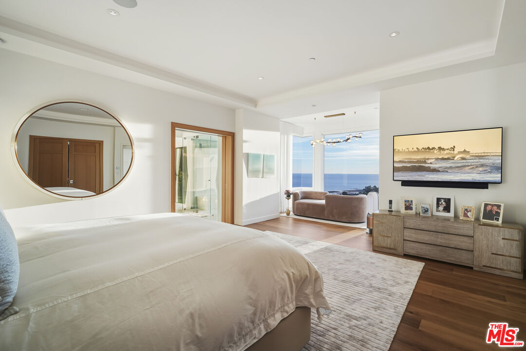 A pristinely redone and truly breathtaking Malibu "Serra Retreat" estate with commanding ocean views spanning the Malibu Pier, Surfrider Beach, and the endless whitewater coastline, securely positioned behind the 24-hour guard gates of Serra Retreat, Malibu's most prestigious private enclave. A future equestrian estate awaiting vision and execution, this extraordinary offering presents a rare opportunity to create a world-class compound with a riding ring, guest residence, staff quarters, and resort-style amenities (buyer to conduct their own due diligence). Completely remodeled, the home is an elegant fusion of farmhouse-inspired exterior architecture and a richly layered warm-modern interior, embodying refined luxury, quiet sophistication, and one of the most commanding coastal vantage points in all of Serra Retreat. Every detail has been thoughtfully curated to elevate both form and function, creating a residence that feels timeless, substantial, and undeniably glamorous. Privately set on 3.3 acres across two parcels, the estate offers immediate luxury paired with exceptional future potential. The second parcel allows for the addition of a pool, tennis court, guest home, and equestrian riding ring (buyer to conduct their own due diligence), while directly bordering miles of protected hiking, biking, and horseback riding trails; an extraordinary blend of oceanfront drama and serene natural beauty.The residence spans approximately 5,548 square feet and features four ensuite bedrooms and four-and-a-half baths. A long, private gated drive leads to a formal entry where dramatic ocean views immediately captivate, framed by soaring vaulted ceilings, exposed wood beams, bespoke detailing, and expansive walls of glass capturing the coastline from nearly every room. From the moment of arrival, uninterrupted sightlines draw the eye outward to the Pacific, with sunlight dancing across refined interiors.A full-length ocean-view balcony extends across the home, offering a front-row seat to glowing sunsets, rolling surf, and the iconic Malibu Pier below. The main level is masterfully designed for both grand entertaining and intimate daily living. A sun-drenched living room features vaulted wood-beam ceilings, a sculptural metal fireplace, and inviting seating perfectly positioned to enjoy the coastline and evening skies. A full bar, formal dining room, and multiple lounging areas appear to float above the ocean, creating seamless flow throughout. The chef's kitchen is both striking and highly functional, appointed with custom white-oak cabinetry, high-end stainless steel appliances, an expansive center island, fireplace, and walk-in pantry ideal for refined entertaining or quiet mornings overlooking the sea. Completing the main level are a guest bedroom with a second-story loft and additional sleeping area, a well-appointed laundry room, and a private dry sauna.A wide custom staircase leads to the lower level, where a generous entertainment lounge transitions into the primary suite; a luxurious private retreat bathed in natural light and breathtaking coastal views. Floor-to-ceiling windows frame the horizon, while the spa-inspired bath features a soaking tub, separate shower, and dual vanities. The suite opens directly to a private outdoor hot tub, perfectly positioned to capture Malibu's legendary sunsets in complete privacy. Two additional ensuite bedrooms provide beautifully appointed accommodations for family and guests. Additional features include an oversized three-car garage, parking for five or more vehicles, and two graded pads ideal for future enhancements. Just moments from Cross Creek, world-class shopping, dining, and the beach, yet entirely removed from the noise,this remarkable estate delivers a rare combination of security, accessibility, acreage, and awe-inspiring views. Bold, glamorous, and unmistakably Malibu, located within one of California's most exclusive gated communities.