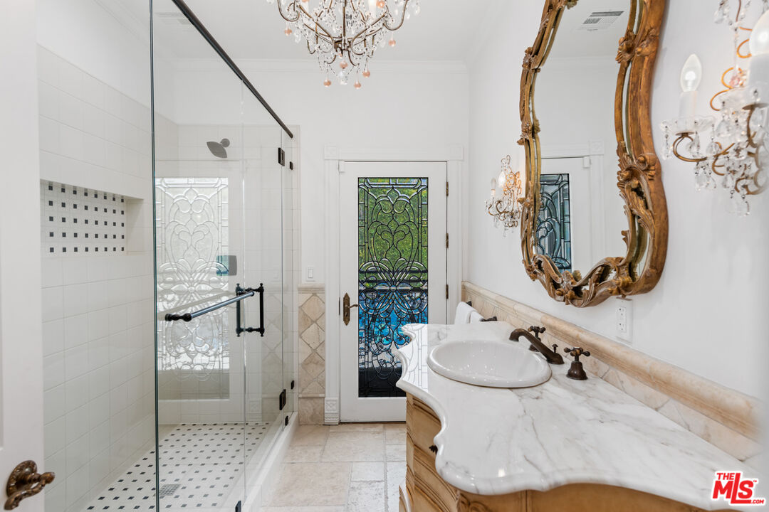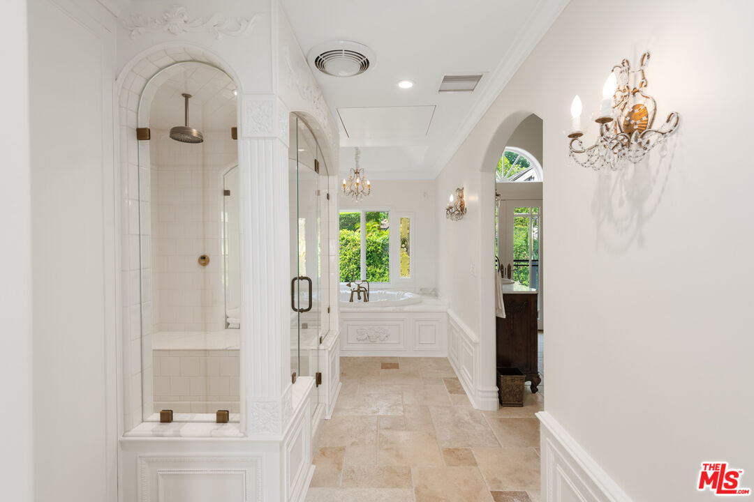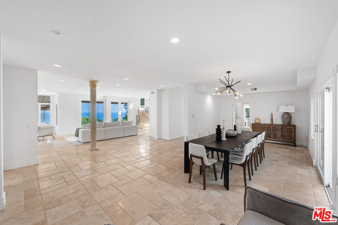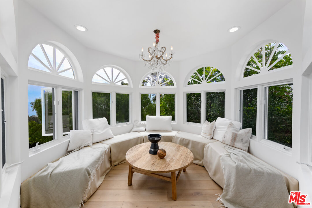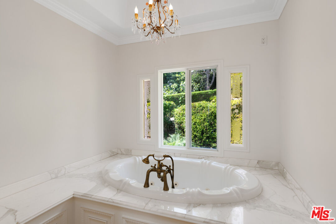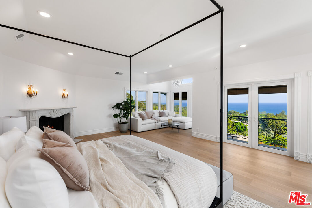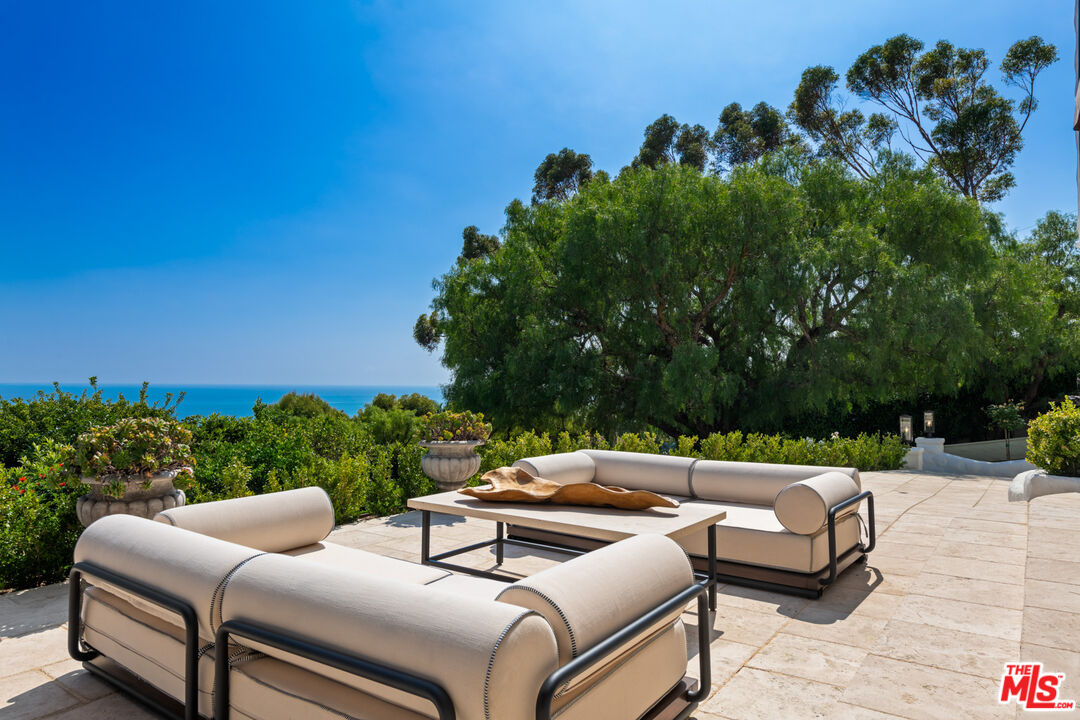 Welcome to your private paradise, where a long driveway leads you to this magnificent Normandy-style estate. Privacy hedges and mature trees surround the property, creating an oasis of tranquility. As you approach the main house, a charming fountain greets you, along with lush turf lawn areas that complement the landscape. This exceptional residence offers breathtaking ocean views from the front yard. Step up to the covered front door, and through the double glass doors, you'll find yourself in an inviting foyer with stone tile floors.Straight ahead, the living room boasts the same stone floors, French doors, and more captivating ocean views. A large gas fireplace with a beautiful mantle provides a cozy focal point, while a nook within the living room offers stunning ocean and mountain views.Behind the living room, the dining room features high ceilings and stone tile floors. Sliding glass doors open to the backyard, creating a seamless indoor-outdoor dining experience. A hallway leads to the gourmet kitchen, accessible from the front door as well. The kitchen features stone tile floors, high ceilings with recessed lighting, granite counters on the island, and top-of-the-line appliances, including a Sharp microwave, a Sub-Zero fridge and freezer, a double GE oven with convection and self-clean capabilities, a mini wine fridge, and an Asko dishwasher. Additional stone counters with a sink and ample built-in storage make this kitchen a chef's dream. A deep walk-in pantry offers even more storage space and includes another Whirlpool fridge and freezer. Adjacent to the kitchen is a butler's pantry and laundry room with granite counters, a sink, and a Whirlpool washer and dryer. This space leads to a full bathroom with a sink, vanity, and shower stall.The breakfast room off the kitchen features curved walls and windows that provide ocean views, high ceilings, and stone counters. A charming powder room with Marie Antoinette-inspired decor, complete with hand-painted blue walls and gold trim, adds a touch of whimsy. A grand staircase with a chandelier offers a dramatic entrance to the second floor, where a large reading nook welcomes you. The owner's suite includes wide plank wood floors, two sets of French doors leading to a balcony with ocean views, a marble fireplace, and a sitting area. The owner's bathroom is a true sanctuary with a water closet, a linen closet, a shower stall with a marble bench and double shower heads (including a rainfall shower), and a built-in tub with jets. The bathroom opens to a spacious area with double sinks, a vanity, stone counters, and French doors to a balcony. A walk-in closet with built-ins provides ample storage space. The top floor features a second suite with ocean views, a fireplace, French doors to balconies, and a circular sitting room with ocean views. The ensuite bathroom boasts marble counters, a freestanding tub, and a shower stall. A walk-in closet completes this luxurious retreat. Includes 6 parking spaces, a sprinkler system, an AC system, and security cameras throughout. The backyard is a haven with a jacuzzi, a pristine pool with matching tile, and a covered awning with an open patio area for outdoor dining and lounging. Steps lead through the trees down to the driveway, and a built-in BBQ by the jacuzzi is perfect for entertaining. *Lease includes main house & guest only. Second guest house above garage is not included.*